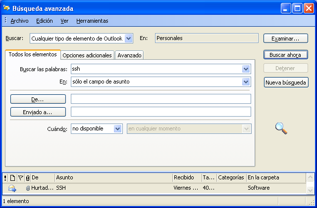 Por supuesto, la funcionalidad de búsqueda resulta indispensable pero desafortunadamente de poca ayuda cuando se trata de localizar a un directorio para mover a éste un mensaje. El cuadro de diálogo de «Búsqueda Avanzada» nos permitirá buscar un mensaje mediante distintos atributos pero nada de los que nos proporciona la lista de resultados no dará la ruta completa para llegar a éste.