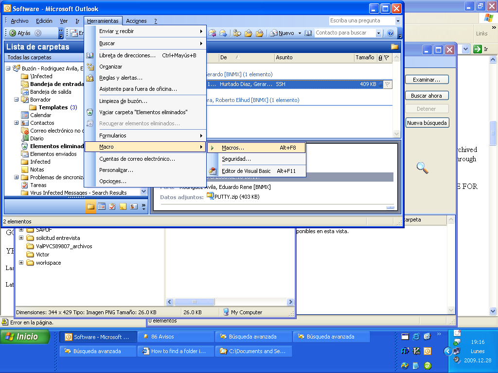 La siguiente ocasión que se busque un directorio en particular podrá recurrirse a la funcioanlidad de búsqueda para localizar algunos de los mensajes que éste contiene. Entonces, bastará arbir uno de éstos y abierto seleccionar las opciones para ejecutar macros (Herramientas > Macro > Macros…). En el cuadro de diálogo que se mostrará se seleccionará la macro que creamos y se dará click en Run. Se mostrará entonces un mensaje indicando la ruta de directorios en la que el mensaje está enterrado.
