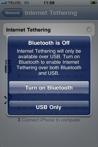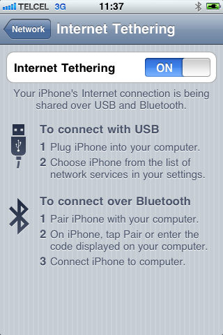 Activar la opción de Internet Tethering nos da dos opciones para compartir la conexión a la Internet del iPhone: por USB o por Bluetooth, cada una con sus instrucciones. Para el caso de Bluetooth, con lo que ya se ha hecho, las instrucciones mencionadas ya han sido seguidas.