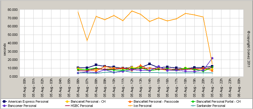 Y para que lo anterior no quede en meras percepciones y dichos, incluyo aquí el reporte de Gomez, que es un servicio encargado de medir y monitorear el tiempo de respuesta y disponibilidad de servicios en red (la Internet principalmente), entre varios. Esta gráfica muestra los tiempos de respuesta de algunos de los principales portales bancarios, incluidos en el Banamex y Bancomer