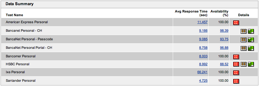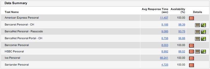 y esta tabla muestra estos datos juntos con el de disponibilidad del servicio. Puede verse que Bancomer muestra un 100% de disponibilidad (al igual que otros bancos), mientras que no es así para los servicios de Bancanet.