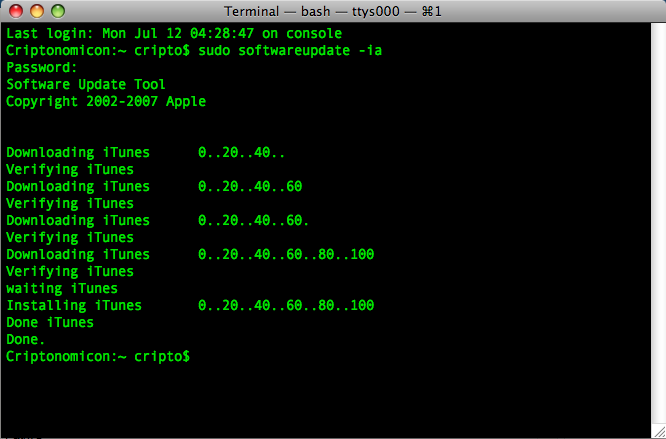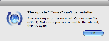 Así que lo conecté, esperé a que se hiciera el obligado respaldo y entonces procedí a ver que se buscarán las actualizaciones disponibles. Un aviso indicó que el iOS 4 estaba disponible para su descarga pero requería iTunes 9.2. Procedí entonces a que el Software Update actualizará las aplicaciones de la MacBook pero ahí me tope con el siguiente mensaje de error: