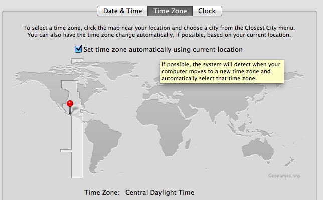 Tenía tiempo que no me metía a ver las preferencias sobre fecha y hora en mi MacBook. Veo que ya está soportada la ubicación del equipo a través algún servicio o característica de las redes Wi-Fi. Antes uno sólo tenía la posibilidad de seleccionar la zona horaria de un list box. En mi caso la ubicación llegó a nivel de delegación.