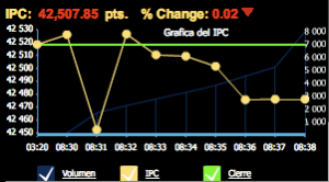 A diferencia de ese día, que pintaba de verde muchas cosas, ayer hubo  mucho rojo. No me extrañaría que fuera una toma de utilidades por las ganancias del día anterior. La gráfica del IPyC parecía señalar que sería una jornada de descenso del record alcanzado ayer.