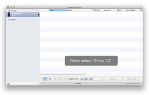 Ayer escribía sobre el mensaje de Image Capture indicando que no se detectaba un dispositivo. Una nota adicional sobre el tema, es que el bloqueo en el teléfono pudiera evitar que el contenido de éste pueda ser leído por la aplicación. Yo supondría que en tal caso un mensaje, como el abajo mostrado, sería reportado por Image Capture pero no puedo asegurarlo. Así que el consejo al tratar de transferir fotos o lidiar con un mensaje que indica que no se detecta el dispositivo de origen de la transferencia, es que éste no tenga algún bloqueo activado.