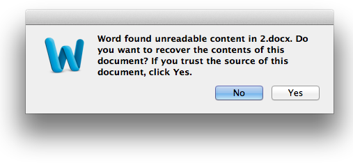 Todo esto en la versión MS Office for Mac 2011 en OS X 10.9. El aceptar la recuperación del documento parece que funciona sin perder algo del contenido del archivo. El error también lo reporta la versión Word 2013 en Windows 7 Profesional Service Pack 1.