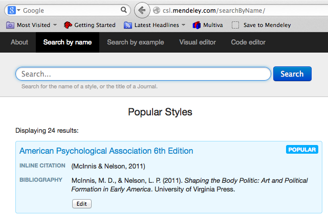 - En la lista de resultados, dar click en Edit. Después de ésto, si uno no se ha firmado, Mendeley pedirá hacerlo antes de presentar el editor de estilos.