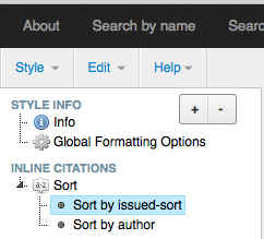 - Una vez que el editor muestre el registro, seleccionar del lado derecho INLINE CITATIONS > Sort y arrastrar Sort by issued-sort para que esté arriba de cualquier otra opción.