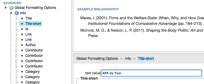 - Click en Advanced > Title y Title-short para darle un título distinguible al nuevo estilo. En este caso fueron APA 6th Ed. – Sort by Year y APA by Year, respectivamente.