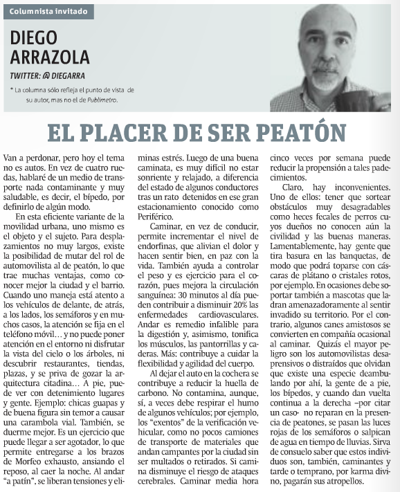 - Diego Arrazola, «El placer de ser peatón«, Publimetro, pág. 28, Ciudad de México, 2014.10.29.