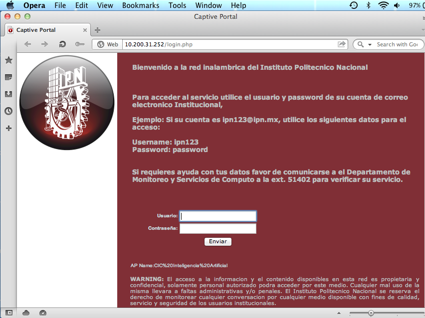 para mi sopresa el CNA hizo su aparición y me mostró la página de autenticación.