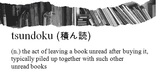 Tsundoku. El continuo acto de comprar libros pero nunca leerlos, apilándolos en la habitación y disminuyendo, con cada uno, la oportunidad de leer los previamente adquiridos. El origen de «tsundoku» se encuentra en el slang japonés «tsun-doku» (積ん読). 積ん読 viene de 積んでおく («tsunde-oku«) «apilar cosas para después» y «dejar» o quizás más apropiadamente «apilar y dejar para después», y 読書 («dokusho«) «lectura de libros». Tsundoku es también un término empleado para referirse a libros listos para leerse después cuando están en una repisa.