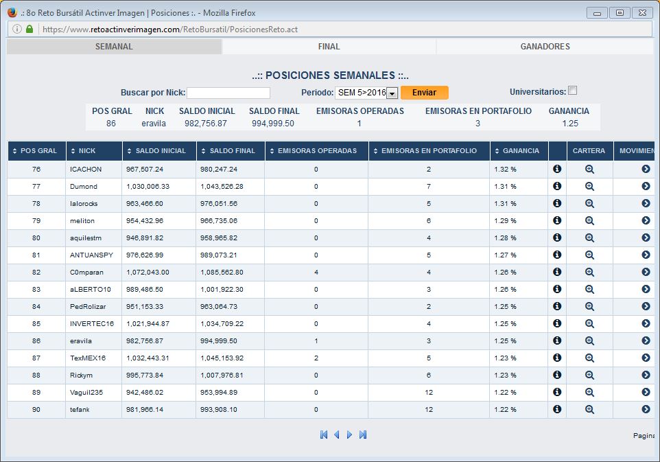 2016.11.012016.11.01 Eduardo René Rodríguez Ávila Día 8.22 Pues bien, hasta que se me hizo el poder estar entre las 100 primeras posiciones, las que pueden consultarse en el panel de resultados. El día de hoy amanecí en la posición 86. Hoy estaré probando con LACOMER.UBC. Tu voto:Comparte esto:Tweet Enviar un enlace a un amigo por correo electrónico (Se abre en una ventana nueva) Correo electrónico Más Imprimir (Se abre en una ventana nueva) Imprimir Compartir en Reddit (Se abre en una ventana nueva) Reddit Compartir en TumblrPocket Compartir en Telegram (Se abre en una ventana nueva) Telegram Compartir en WhatsApp (Se abre en una ventana nueva) WhatsApp Me gusta Cargando... Related