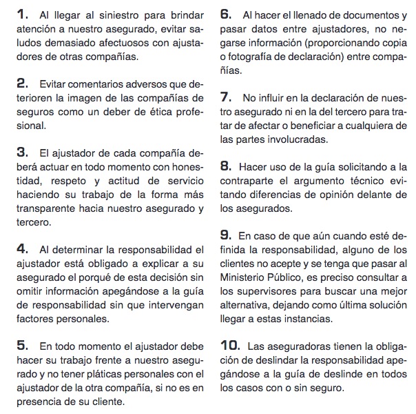 Me ha tocado ver (tanto como espectador, como cliente), por ejemplo, como llegan los ajustadores al siniestro y se saluda como si fueran de la misma familia y hablan de eventos o actividades que harán por la noche o fin de semana, aprovechando que se ven. No se besan porque… bueno, el caso es que el primero punto, para mi no lo respetan. Del segundo punto, igual y echan pestes de su empleador, por lo que el tercer punto resulta ya cuestionable. En fin, no voy a revisar cada punto. Les dejo lo lean y cada uno que hable por su experiencia.