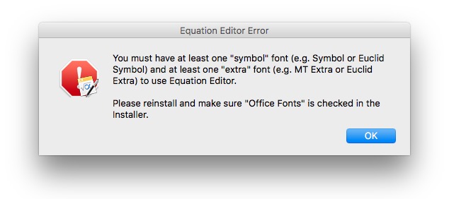 Recientemente me ocurrió que al tratar de ejecutar el editor de ecuaciones de Microsoft Word for Mac 2011, éste no funcionaba o mostraba un mensaje de error. En mi caso cuento con la instalación tanto del Office for Mac 2016 como la ya mencionada. Coexisten muy bien.