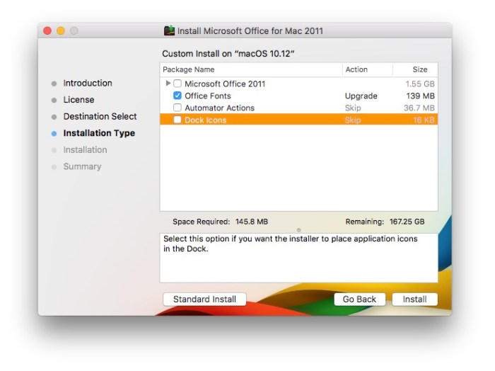 El problema muy posiblemente se debió a que consideré que los fonts ya instalados para el Office for Mac 2011 no serían ya útiles o que debería estar usando los de la versión 2016. Tengo la impresión que los eliminé en una de esas operaciones de recuperación de espacio en disco que uno hace de cuando en cuando para quitar cosas que uno cree ya no son necesarias.