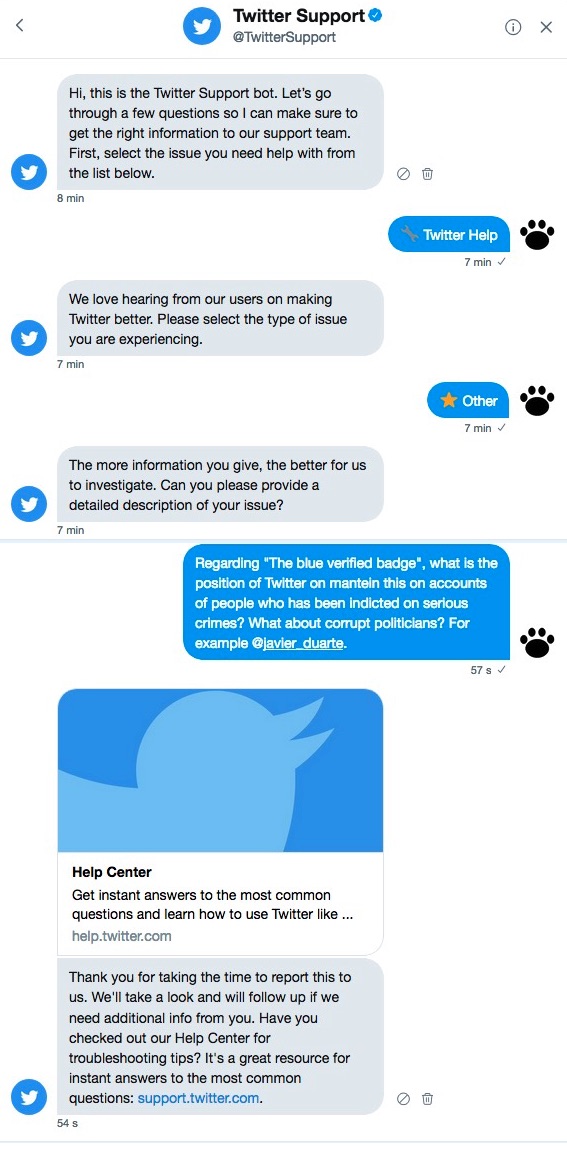 Navegaba hace un rato en Twitter, checando algunas notificaciones recibidas en respuesta a algunos tuits. En la página de Twitter aparecieron avisos relacionados con el pillo de Javier Duarte. Por alguna razón me llamó la atención y al dar clic en la liga, noté que la cuenta de este señor en Twitter tenía la famosa palomita azul. De inmediato la cuestión, ¿merecía tenerla? ¿Cuál es la posición de Twitter de dar este tipo de distinciones a personas buscadas por la ley? Procedí a hacer el correspondiente inquiry.
