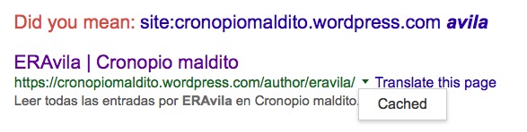 En los resultados devueltos, busqué el resultado correcto. Al hallarlo, en el URL, di click a la flechita, que me mostró la opción «Cached«.