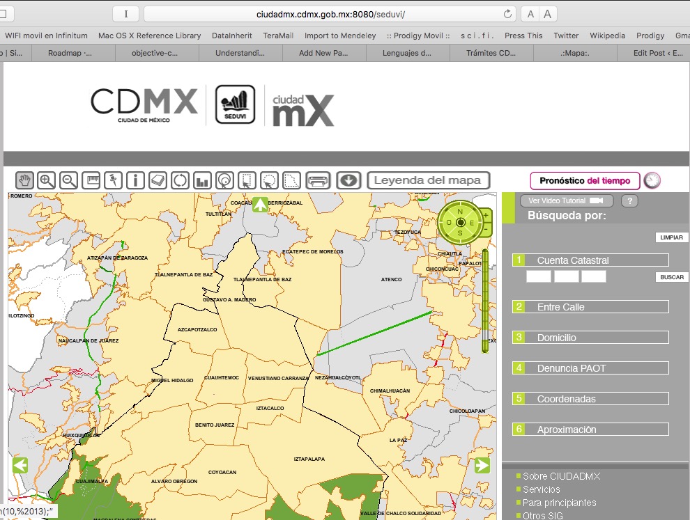 Al parecer hay dos sistema de información geográfica que el gobierno de la CDMX maneja. Por una parte tenemos a la Oficina Virtual del Catastro (OVICA), la cual nos lleva al URL http://ovica.finanzas.df.gob.mx/Mapa.aspx. Este, al menos al tiempo en que elaboro esta entrada en el blog, no me da mas información de la que Google Maps podría darme (quizás sólo los límites de propiedad). La aplicación, además, se cuelga si uno pide información de una zona señalada. No es complicada de usar pero si es desesperante.