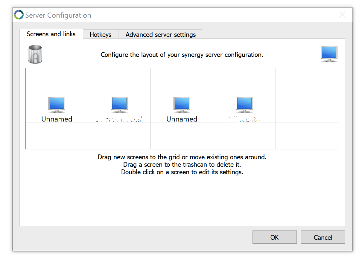 Sin embargo, contrariamente a como las instrucciones de esta ventana de configuración sugieren, «screen» no se refiere literalmente a una pantalla sino a un equipo. Después de agregar estas «pantallas» parea tratar de representar la configuración física de mis equipo, Synergy dejó de funcionar. Me refiero a que cliente y servidor dejaron de hablarse. Obviamente esto me hizo revisar las conexiones de red, interfaces y sus configuraciones (y maldecir nuevamente por lo complicado que es llegar a esto en Windows). No fue hasta que caí en cuenta de mi error y retiré las «pantallas» que todo regresó a la normalidad (aprendí algunas cosas nuevas en el proceso, pero eso será tema de otra entrada en el blog).