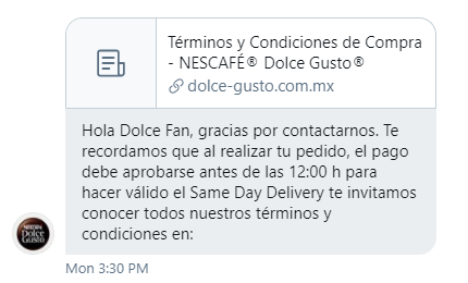 y la verdad se tardaron en dármela, pues esto ya me los habían dado como explicación del porqué el pedido podía no ser atendido el mismo día, además de algunas otras restricciones o condiciones: