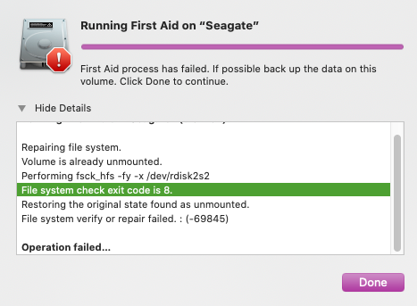 Probé conectándolo en la otra mac pero igual. Simplemente se escuchaba y sentía que el disco estaba haciendo algo pero no se montaba. Al tratar de verlo en Disk Utility algunos errores aparecieron: