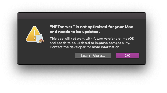 Tal cual ocurrió cuando hice mi transición a macOS 10.14 «Mojave», después de estar trabajando con aplicaciones que funcionaban muy bien desde macOS 10.9, mensajes como el ilustrado abajo aparecen conforme al reinstalar aplicaciones. La documentación de Apple1 indica que esto es debido a que las aplicaciones de 32 bits dejarán de ser soportadas y este es el último aviso para su migración (aunque el usuario francamente no tiene mas que atenerse a lo que el desarrollador le provea).