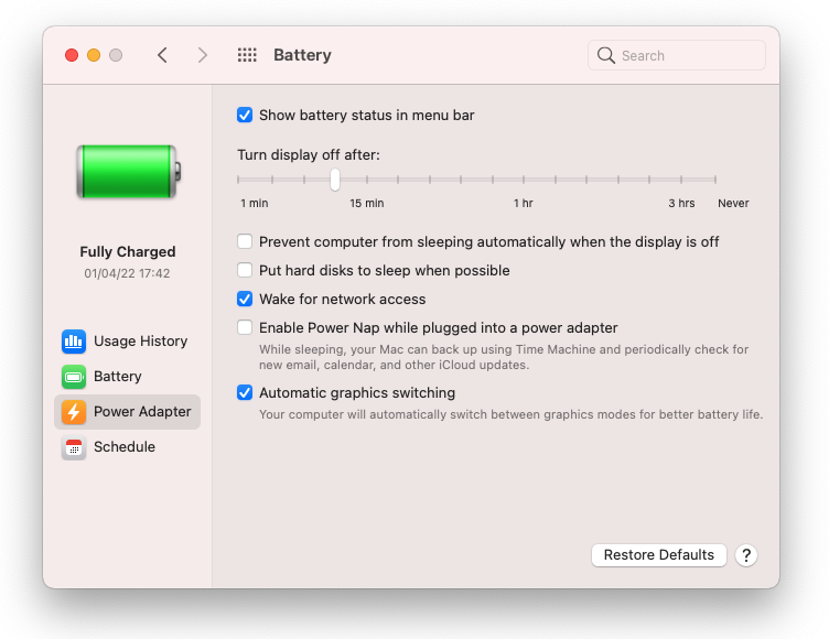 Para el caso del nuevo equipo, a diferencia de mi M1, el panel de preferencias del sistema muestra una opción adicional: «Enable Power Nap«, tanto para las opciones de Battery y Power Adapter. Tanto esa opció como la de «Put hard disks to sleep when possible» fueron desactivadas.