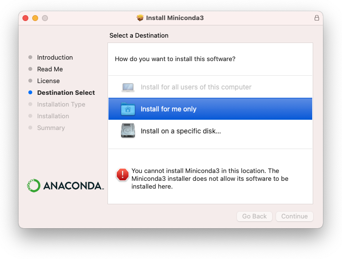 Desaparecido el error, se habilitarán los botones y dando click en Continue y posteriormente en Install (ver imagen más abajo), el proceso de instalación iniciará y sólo requerirá acceso al directorio donde se descargó el archivo .pkg (al menos eso ocurre en macOS «Big Sur» en un equipo «Intel inside«) al final del proceso. El resultado es la instalación de Miniconda3 en la ruta $HOME/opt, más la creación o modificación de algunos archivos ocultos (de configuración y profiles) en $HOME.