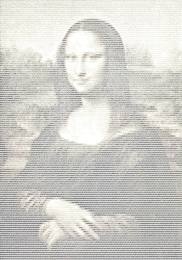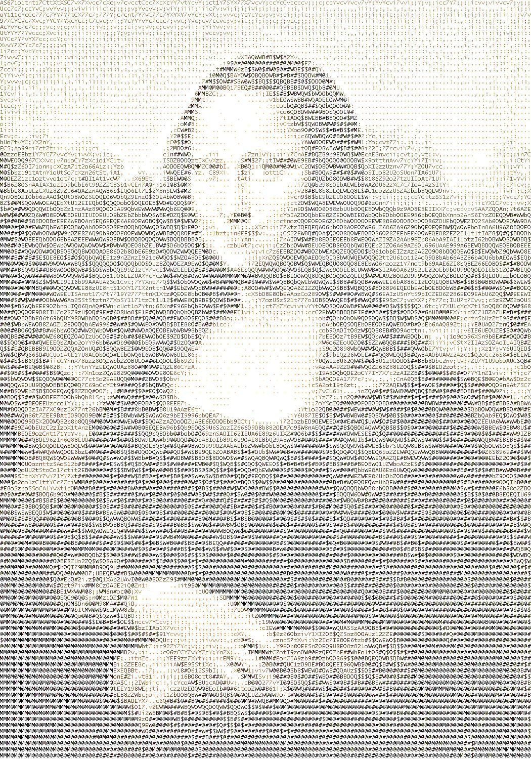 La escuela (la UPIICSA) contaba con una HP-3000 en la que en alguna cuenta o directorio había archivos para generar imágenes con las impresoras. Pesadas, ruidosas impresoras de cadena. Teníamos prohibidísimo imprimir esos archivos por el gasto de papel y tinta que representaban, aunque algunos osados lo hacían y eran vetados de los servicios de impresión (por el resto del semestre o en forma permanente) en castigo. De esos archivos, el mejor era el de la Gioconda, con una apariencia como la que muestro abajo4.