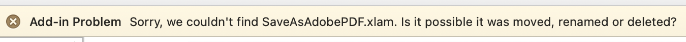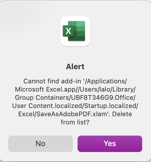 ¿A raíz de qué pasó? No estoy seguro pero me inclino a pensar que fue tras eliminar el Adobe Acrobat Reader de mi equipo. Este error aparece cada que arranco al Excel en mi mac.