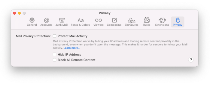 Tras la actualización a macOS 12 «Monterey«, me he encontrado con que Mail no mostraba las imágenes incluidas en los mensaje como referencias (contenido remoto que debe ser cargado al mostrar el mensaje, ya no sólo «abierto» sino desde el preview). Aunque llegan a indicar que la solución es deshabilitar el bloqueo de todo contenido remoto (en las preferencias de la aplicación, en la pestaña «Privacy«), lo cierto es que para el caso de correo en Google, el ocultar la IP también afecta. Uno debe reiniciar la aplicación para que tenga efecto el cambio (el contenido que ya se hubiera descargado se seguirá cargando pese a activar estas opciones).