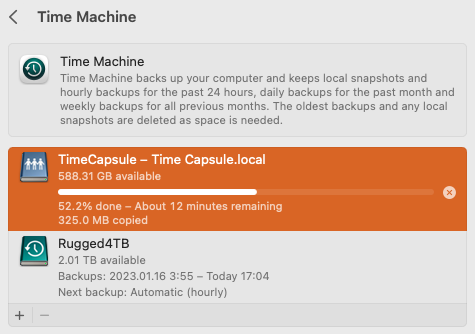 Por otra parte, Según yo, no era posible usar simultáneamente dos destinos diferentes con Time Machine. Con «simultáneamente» me refiero a que sólo uno de ellos es el activo y hasta que se llene, se activa el otro. Así lo leí alguna vez. Pero, al menos siendo uno de ellos una Time Capsule, ya he comprobado que no es así, Time Machine es capaz de administrar ambos (aunque sí, parece que durante el proceso de respaldo sólo uno de ellos puede usarse) y hacer respaldo en ambos según su disponibilidad (que estén o no conectados), sin una limitante o condición como la que menciono.