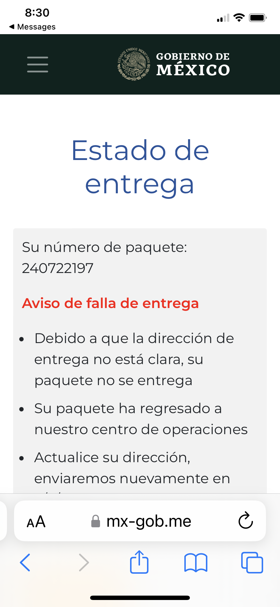 Al dar click sobre el enlace, vi el look and feel típico de una página gubernamental mexicana, ostentándose como de Correos de México. Cómo esto lo estaba haciendo en el celular, el URL al que llegué se mostraba como «mx-gob.me» que no disparó ninguna alerta pensando que por las limitaciones de la pantalla sólo veía una parte de éste o que era una abreviación para el celular (si es que tal cosa pudiera existir).