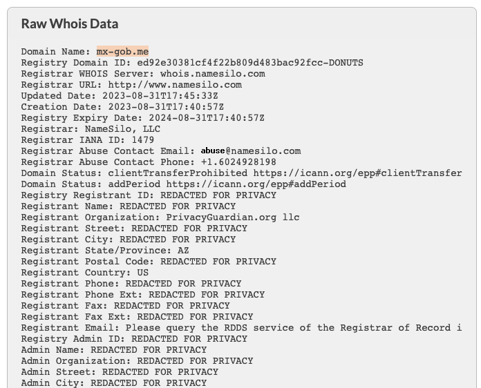 Pero ayer por la noche volví a recibir otro SMS. Así que decidí tratar de hacer algo más. Nuevamente di click en el celular y probé en la computadora. Noté que el número de envío en ambos era diferente. El URL y elementos de la página estaban muy bien «enmascarados» por lo que tratar de sacar algo de ahí seguramente requeriría invertir más tiempo. Decidí revisar quien era el dueño del dominio. De un servicio WhoIs obtuve («https://www.whois.com/whois/mx-gob.me»):
