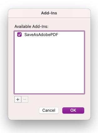 Al checar los add-ins en Powerpoint, SaveAsAdobePDF ya no estaba seleccionado como la ocasión anterior (a la que corresponde la imagen), por lo que procedí a la eliminación de éste, dando click al botón «–«. Esto terminó con el mensaje de error.