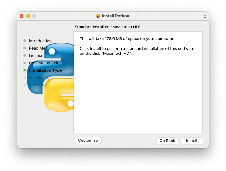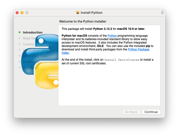 Si bien, desde el retiro del Python 2.7 consideré innecesario el instalar Python con el instalador provisto por la distribución desde python.org, veo que puede ser necesario. También me despierta la duda sobre la convivencia de distintas versiones de Python en /Library/Frameworks/Python.framework/. Así que decidí instalar Python 3.12.3 haciendo uso de la distribución de python.org.