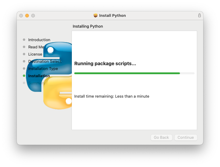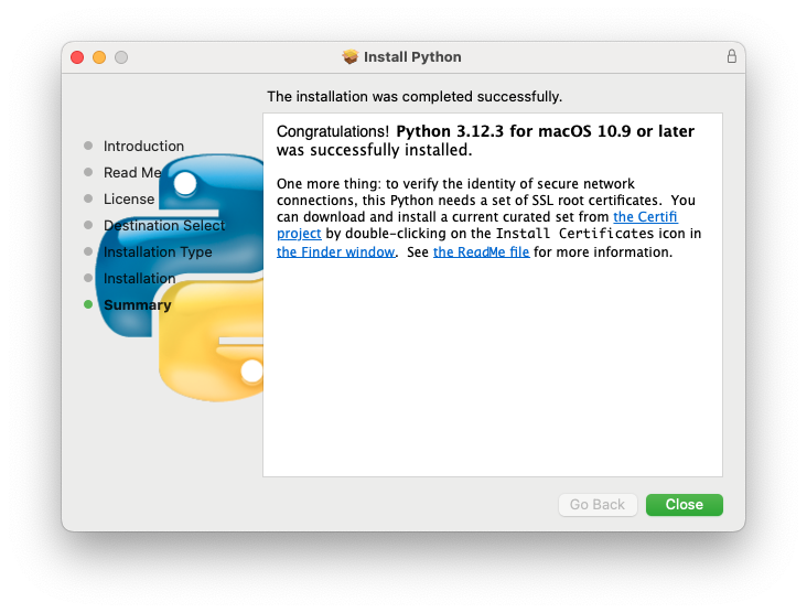 Si bien, desde el retiro del Python 2.7 consideré innecesario el instalar Python con el instalador provisto por la distribución desde python.org, veo que puede ser necesario. También me despierta la duda sobre la convivencia de distintas versiones de Python en /Library/Frameworks/Python.framework/. Así que decidí instalar Python 3.12.3 haciendo uso de la distribución de python.org.