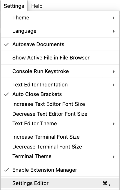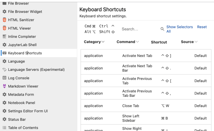 Así que, explorando las opciones de configuración generales del Jupyter Lab (Settings > Settings Editor), accedí a los Keyboard shortcuts.