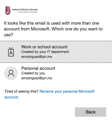 En un inicio, OneDrive permitía registrarse usando cualquier dirección de correo. Es fácil ver que se trató de una estrategia para ganar usuarios y consolidar un posición en un mercado emergente y competitivo regalando espacio de almacenamiento sin la necesidad de tener que «crear una cuenta» (bueno, indudablemente se creaba una cuenta pero, acorde a lo que se estilaba en aquél entonces, no implicaba crear un buzón). También, en mi caso, se me hizo fácil en ese entonces el hacer el registro con mi buzón del dominio del IPN pensando en que podría tener un espacio dedicado a mis asuntos escolares. Quién diría que a la larga, el IPN adquiriría servicios e infraestructura en todo lo que poco a poco, con el paso del tiempo, Microsoft iría conformando. Con ello, terminé teniendo ese espacio personal pero posteriormente también uno institucional, accediendo a ambos con mi misma dirección de correo pero distinto password.