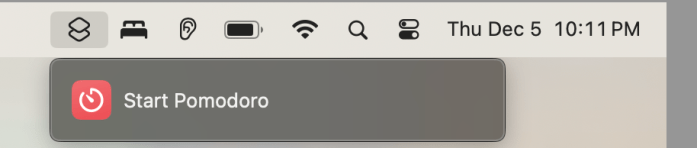 Mi última exploración al respecto fue la de activar un temporizador cada vez que lanzara la aplicación de 𝕏 (antes Twitter), que se ha vuelto un problema de distracción o procrastinación. Si bien logré lo que buscaba, en la exploración inicial llegué a activar un shortcut ya incluido para iniciar un temporizador «pomodoro». Días después me percaté de la aparición de un nuevo icono en la barra de menú de macOS .