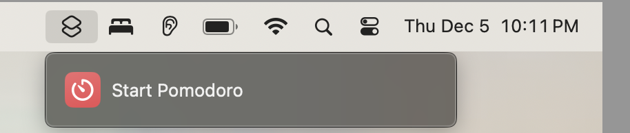 Mi última exploración al respecto fue la de activar un temporizador cada vez que lanzara la aplicación de 𝕏 (antes Twitter), que se ha vuelto un problema de distracción o procrastinación. Si bien logré lo que buscaba, en la exploración inicial llegué a activar un shortcut ya incluido para iniciar un temporizador «pomodoro». Días después me percaté de la aparición de un nuevo icono en la barra de menú de macOS .