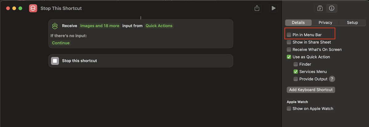 Mediante Shortcuts, uno localiza el «atajo de automatización» Start Pomodoro, clic en el ícono de la «i» y desmarcar la opción «Pin in Menu Bar».