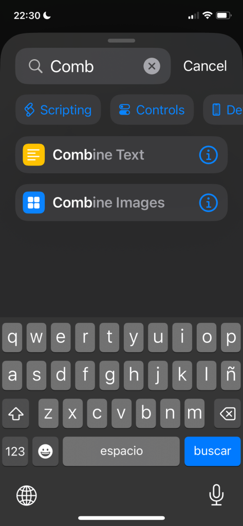 - En la pantalla donde ahora se mostrará la acción del paso anterior, usamos la caja de búsqueda para buscar la acción «Combine images» (si su celular está en otro idioma, habrá que hacer lo propio).