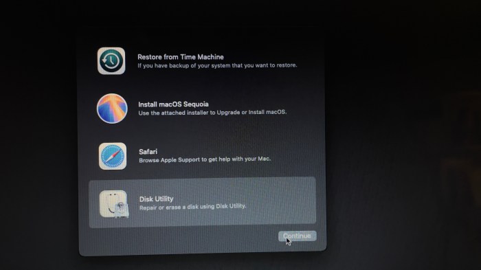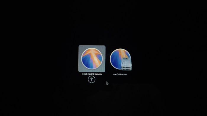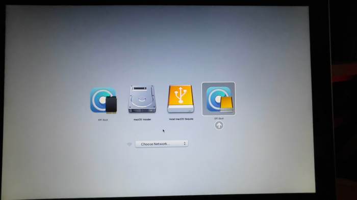 Al finalizar, habrá un reinicio que llevará al menú mostrado abajo y en este el siguiente paso es seleccionar el ícono de macOS Installer (el de los dos discos apilados). Igual, uno debe estar atento o se seleccionará la última opción usada. El orden de aparición de estos íconos varía, no siempre aparecen en el orden que muestra la imagen.