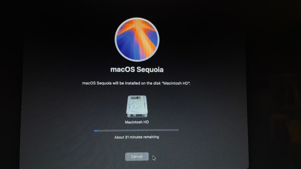 Dado que parecía un catch-22 lo que se sugerían estos puntos, consideré que lo más lógico sería poder lograr arrancar desde el computador destino, aún cuando se continuara usando la USB. Se descargaría el OpenCore y entonces se podría hacer ese último paso para romper la dependencia de arranque. Mientras buscaba como logarlo, volví a arrancar el equipo y, al no ser rápido con los dedos, uno de los dos instaladores arrancó (no supe cual) pero ello permitió ver un paso que no había visto y en el que se presenta una pantalla de instalación mostrando porcentajes de avance.