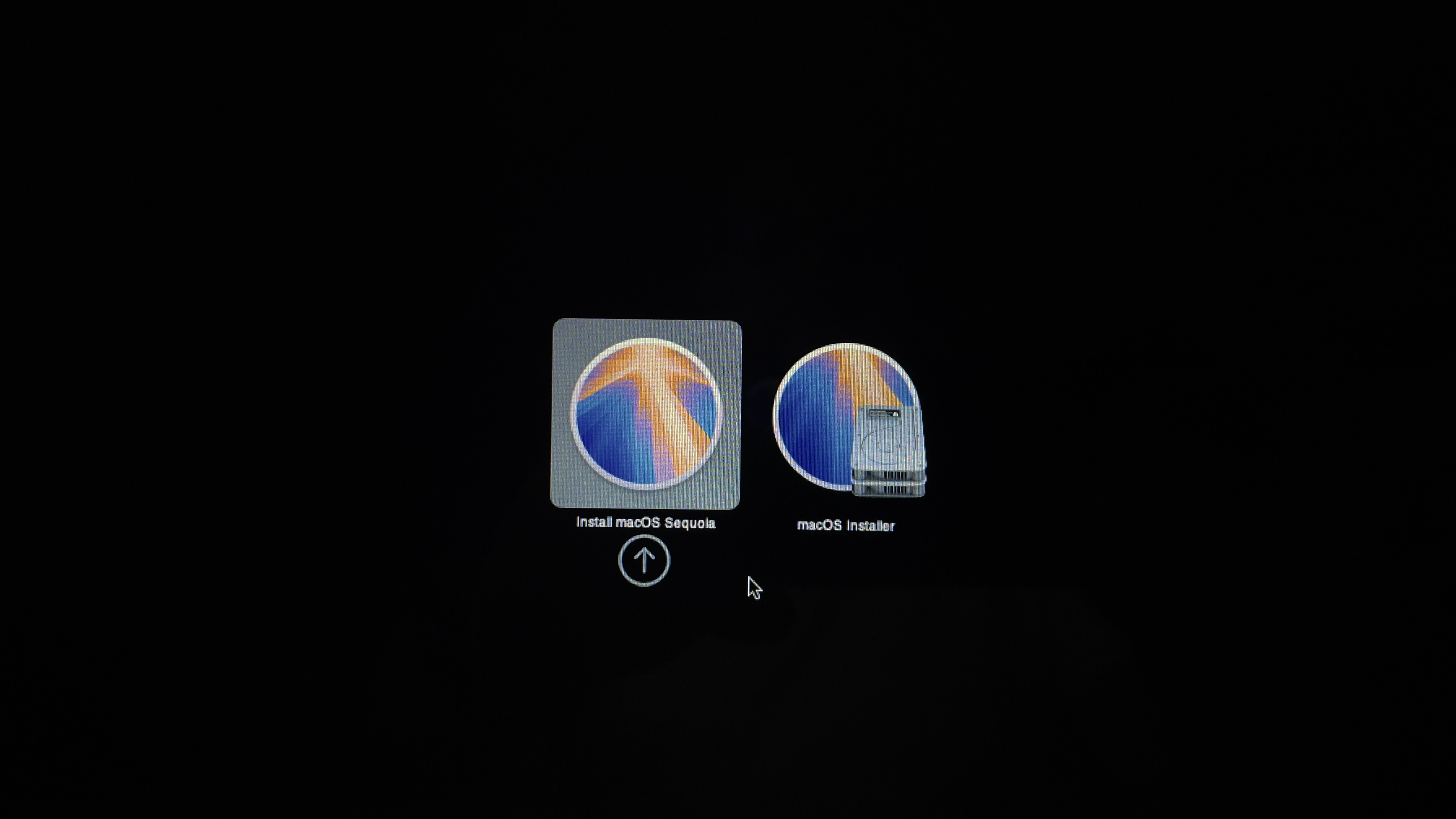 Hasta donde yo recuerdo, después de que uno mantenía la tecla o teclas presionadas para forzar la aparición del menú de bootstrapping, se tenía tiempo para seleccionar sin prisas el disco de arranque. Pero, al menos en el caso de mi vieja MBP, no pasan más de dos segundos para que el computador decida por uno. No se si esto se deba al OpenCore Legacy Patcher pero es algo que también se menciona en el paso 16 de nuestra guía1. Uno debe usar las teclas de flecha para detener el arranque moviendo el foco de atención. El menú de arranque deberá de ser similar al mostrado abajo.