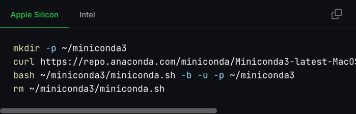 $ curl https://repo.anaconda.com/miniconda/Miniconda3-latest-MacOSX-arm64.sh -o miniconda.sh