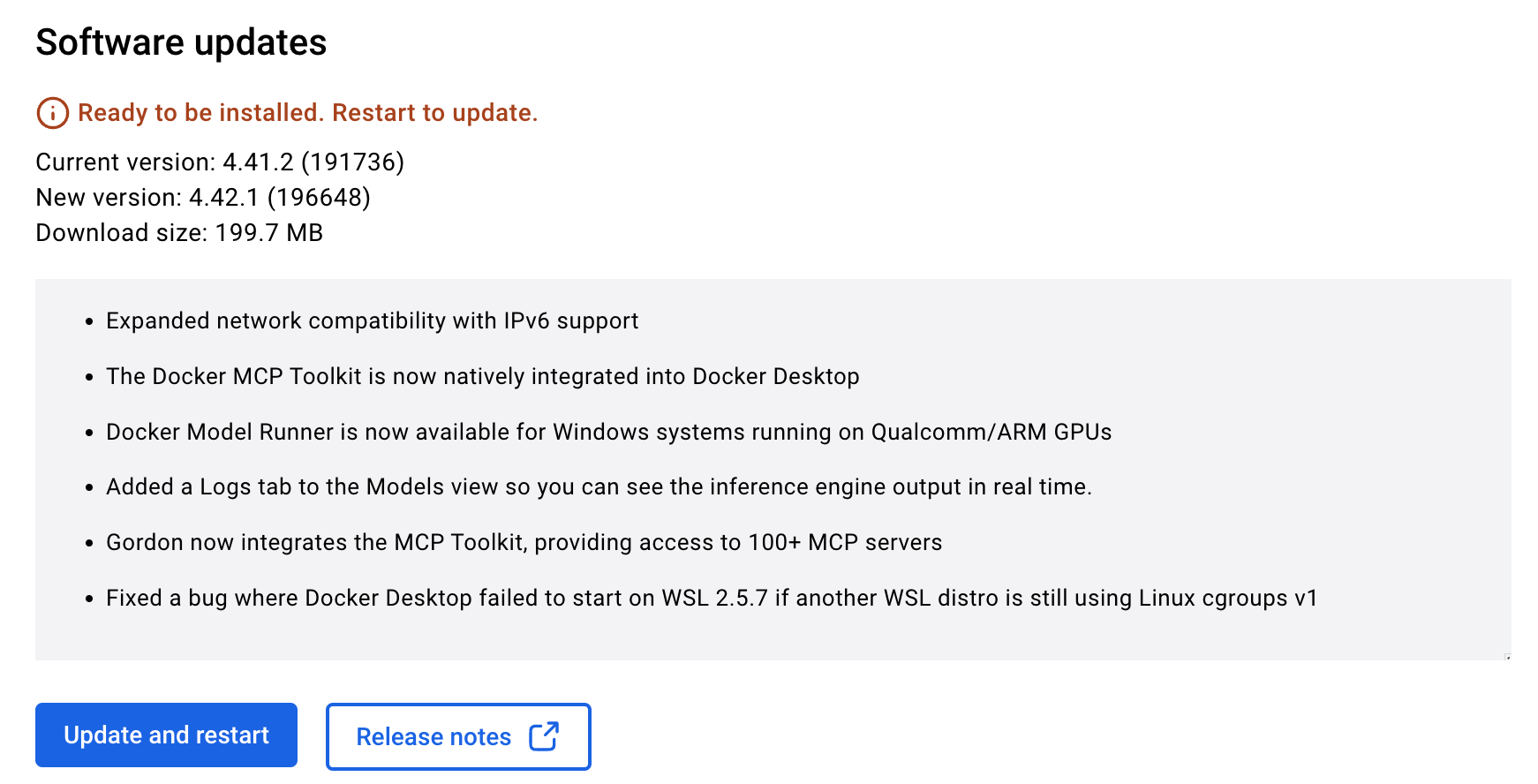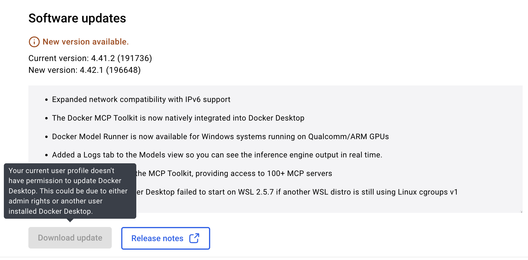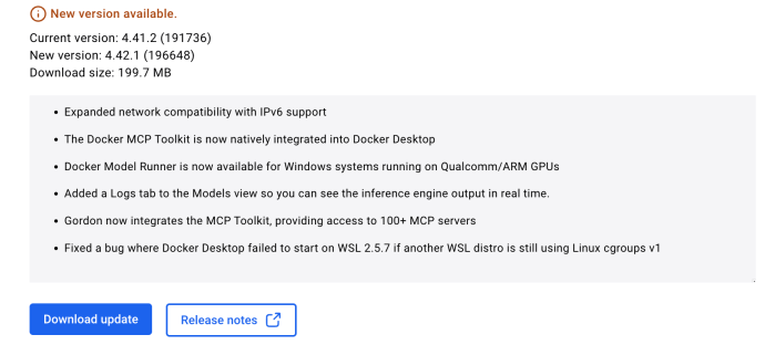 En mi página dedicada a Docker, escribí sobre el problema de sus actualizaciones. Aunque Docker Desktop advertía de actualizaciones disponibles, la actualización no llegaba a efectuarse. Ningún mensaje de error en pantalla o algo que diera una pista siquiera de que algo no había salido bien. El único remedio aparente era desinstalar e instalar.