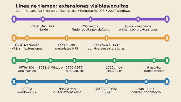 El balance actual es el que en macOS, Finder por defecto oculta muchas extensiones, Windows Explorer oculta extensiones “conocidas”, pero en “Opciones de carpeta” hay un switch para mostrarlas siempre. En Linux (Nautilus, Dolphin, etc.) suelen mostrarlas, aunque con opciones para ocultar si se desea.